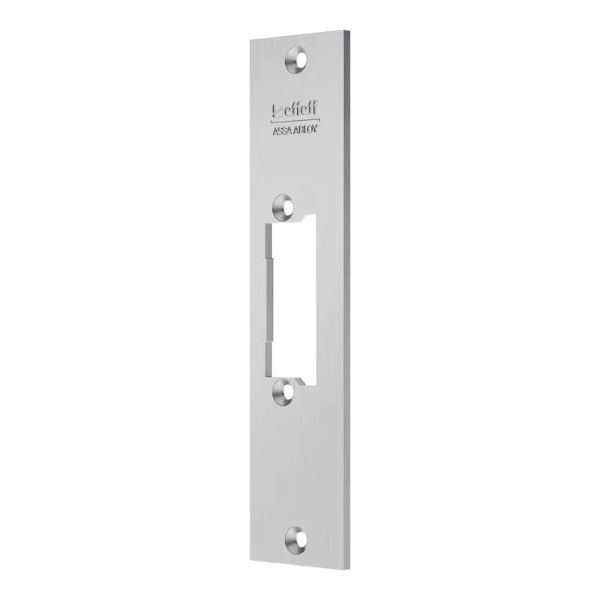 סרט חזית קצר (גימור נירוסטה) להתקנת מנעול חבוי חשמלי eff eff ומשמש כבסיס ייצוב למנעול החבוי החשמלי ומותקן בתוך משקוף הדלת מול לשונית הקפיצית נטרקת של המנעול חבוי
